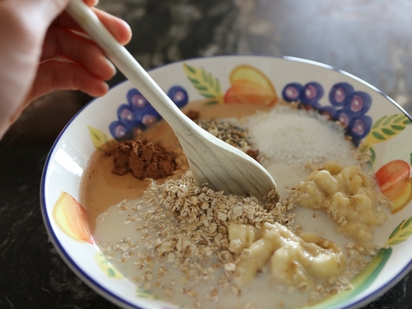 Protein - one serving of this ONO recipe has ~10g. Protein is needed every day to build, repair, and maintain our body tissues. It also helps us to feel more full and satisfied after a meal. Eating smaller amounts of protein more often helps to improve muscle protein synthesis. The sweet spot is ~15-25g (or 0.25-0.3g/kg body weight) per eating event. Add a boiled egg or a 1/4 cup nuts or a cup of milk to your ONO breakfast and you’re golden!